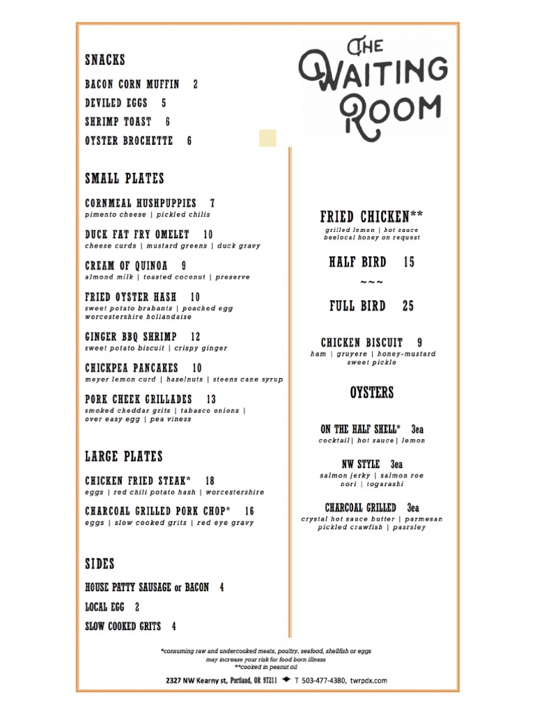 The waiting room whetstone menu. Choice of 2 sides. Smoked braised lamb ribs. Uni toast fava bean leaf chimichurri ham hock marmalade. Home menus about the room eternal optimist club contact us snapshots sitemap 66 e cherry street downtown rahway new jersey 732 382 0900 c2008 the waiting room.